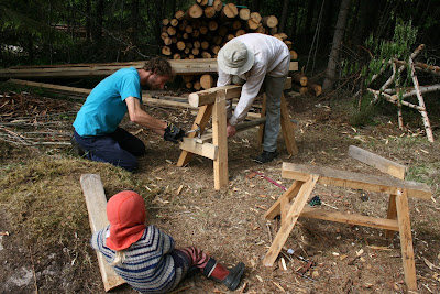 On the right there are the peeled posts (nine 4.5 meters long) and beams (nine 3.4 meters long).